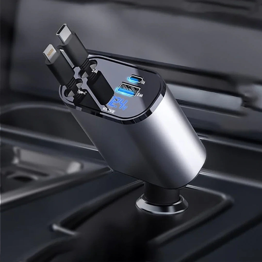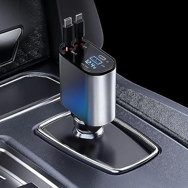 4-i-1 snabb billaddare med utdragbara laddsladdar för iPhone och Samsung med USB-C. Perfekt för alla bilresor!