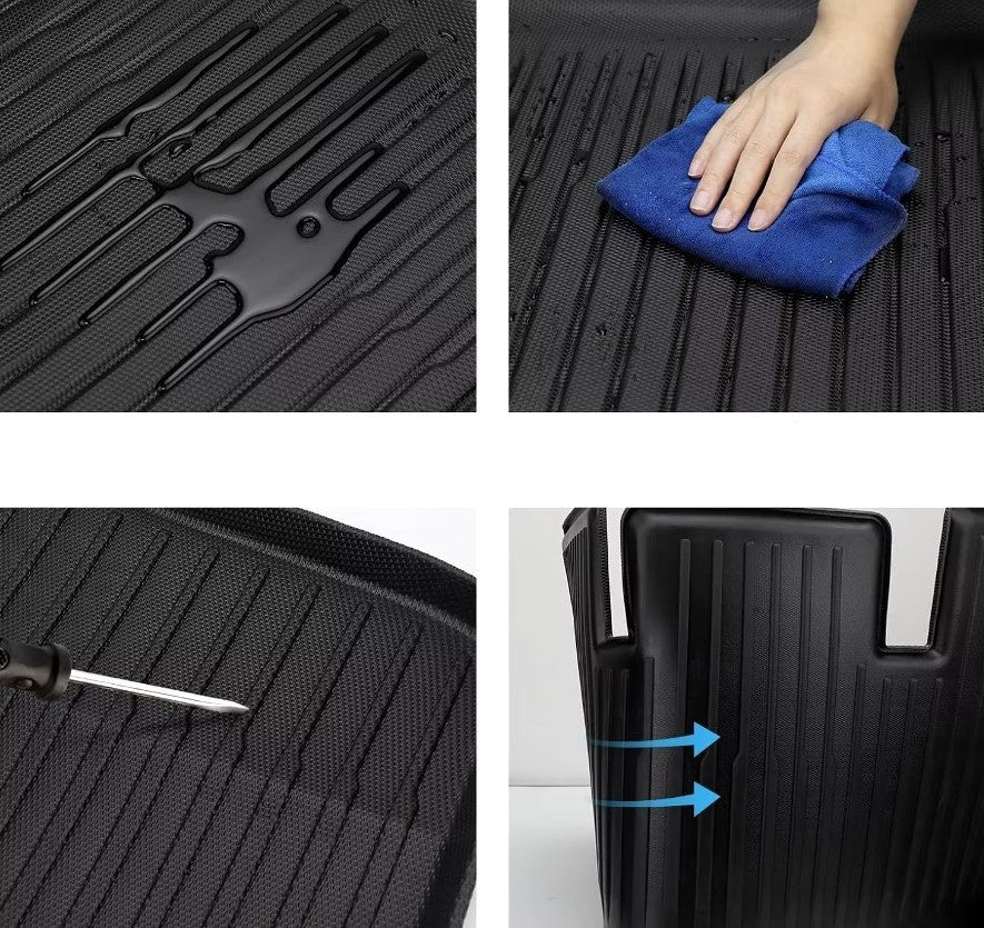 Bagageutrymmet uppgraderas med en XPE vattentät bagagerumsmatta, tålig nog för både tunga laster och oväntade spill, samtidigt som den håller bilen snygg och prydlig. Med perfekt passform för Tesla Model Y förenar dessa bilmattor design och funktion, vilket ger bilen ett elegant och skyddande tillskott som håller den i toppskick året runt.