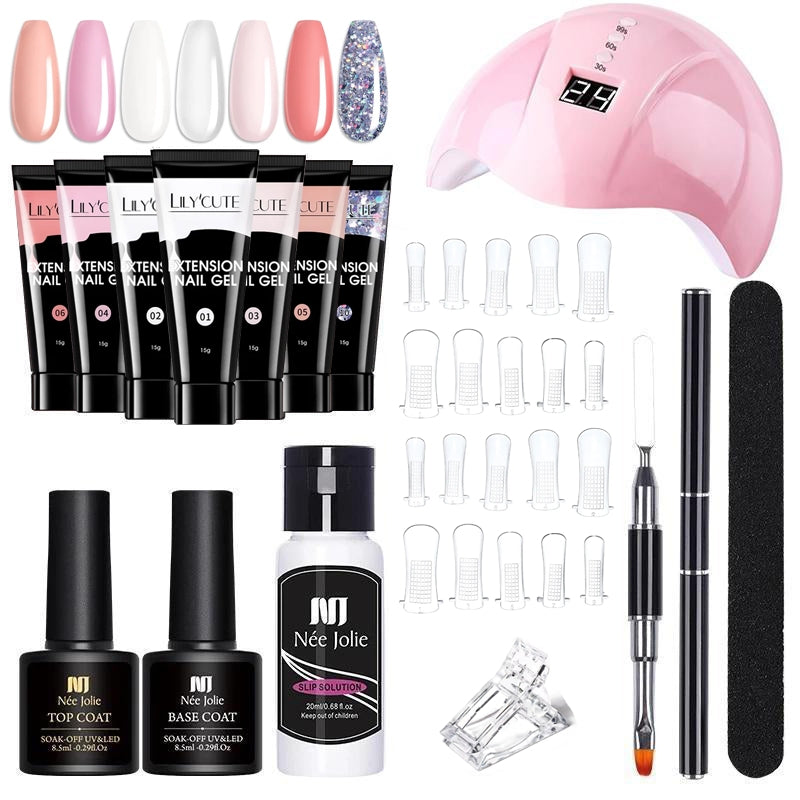 Nail art är en ständigt växande trend och med det här salongsset Poly Builder Gel Kit med UV-lampa kan du enkelt skapa dina egna fantastiska naglar hemma. Den innehåller sju olika färger av gellack, baslack, topplack, nagelformar, penslar, nagelfil och en praktisk UV-lampa. Oavsett om du är nybörjare eller proffs har detta set allt du behöver för att skapa salongsfina naglar!