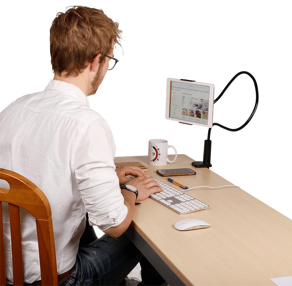Montera enkelt denna smidiga hållare direkt på bordsskivan och håll din telefon eller läsplatta stadigt på plats. Den justerbara och böjbara armen gör det lätt att anpassa vinkeln, perfekt för arbete, underhållning eller videosamtal. Oavsett om du är på kontoret eller hemma, erbjuder hållaren optimal komfort och funktionalitet.