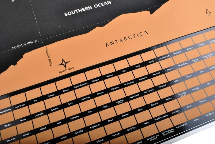 Denna eleganta världskarta med skrapbar yta är perfekt för dig som vill dokumentera och planera dina resor. Ytan är svart- och guldfärgad men när du skrapar visas olika nyanser och exakta konturer av enskilda länder, och tack vare det högkvalitativa skrapningsfoliet är risken för skador minimal. Kartan kan enkelt monteras direkt på väggen som en poster med hjälp av tejp eller monteras på en korktavla. Du kan även rama in kartan och försätta skrapa genom att ta bort det skyddande glaset.
