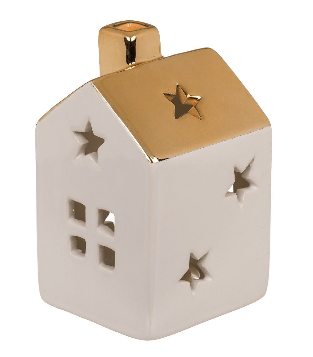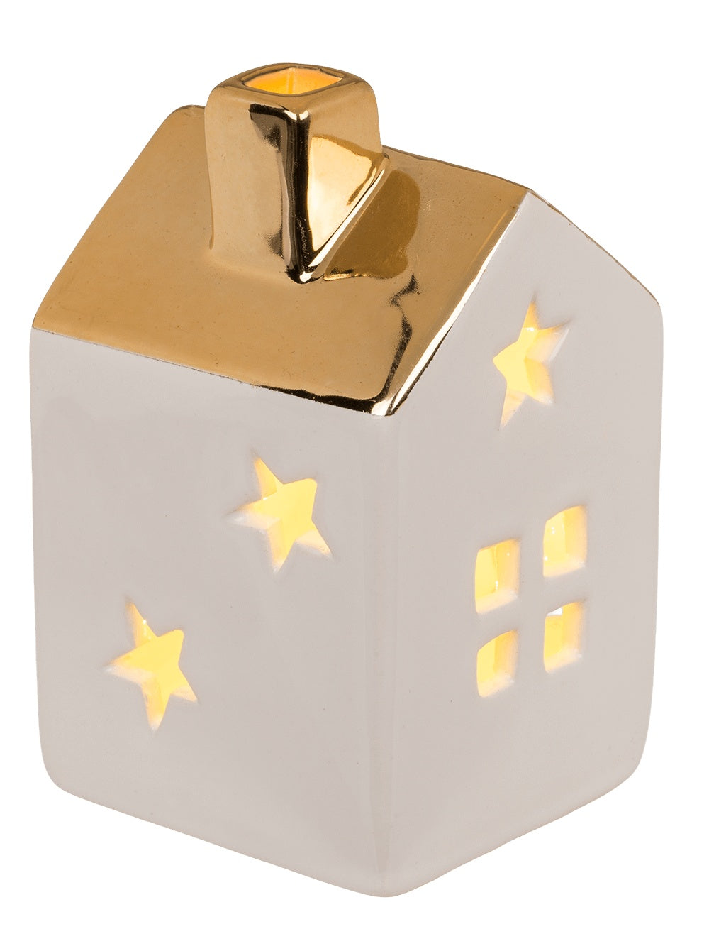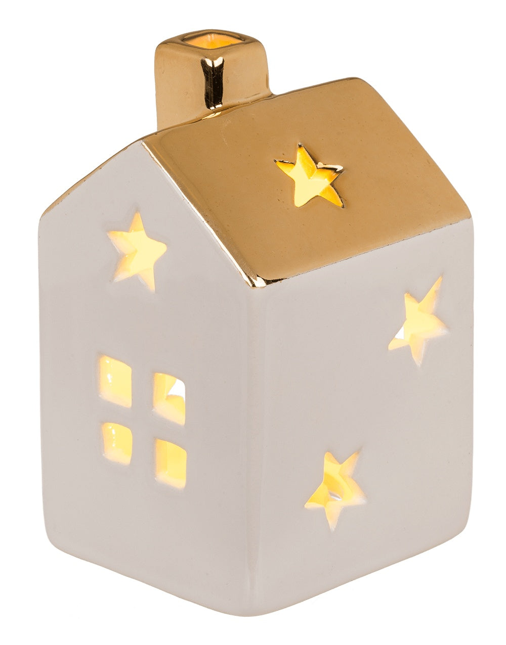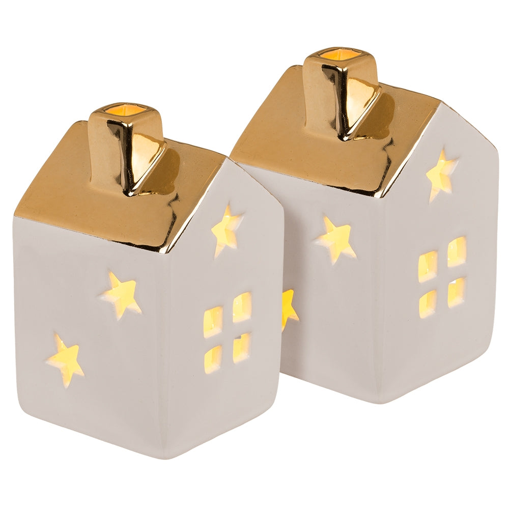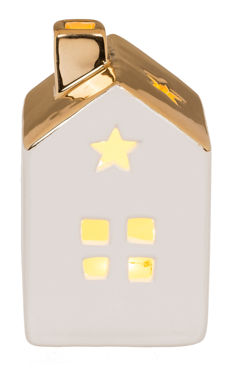 Dessa charmiga keramikhus med gyllene tak och inbyggda LED-ljus ger ett varmt och säkert sken, vilket gör dem perfekta för att lysa upp den mörka årstiden och sprida julglädje. De är inte bara vackra utan också praktiska, och deras tidlösa utseende kommer att förhöja vilken juldekoration som helst.