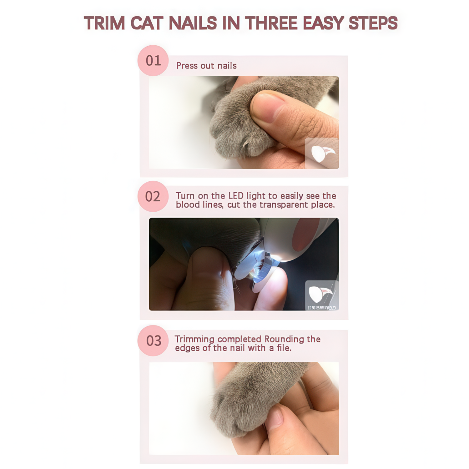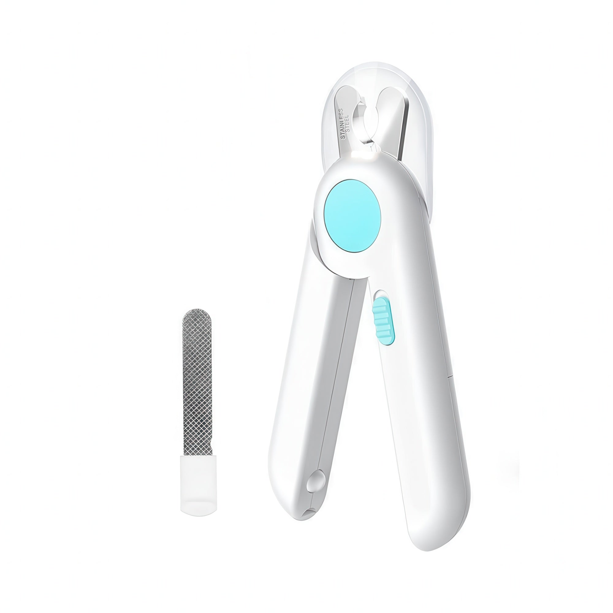 Med denna kloklippare blir det enkelt att klippa klorna på ditt husdjur på ett säkert och bekvämt sätt. Den inbyggda lampan ger tydlig sikt och minskar risken för att klippa fel, vilket gör den perfekt för både nybörjare och erfarna djurägare. Klipparen har ett ergonomiskt handtag som ger bra grepp och kontroll under hela klippningen. Med den medföljande nagelfilen kan klospetsarna jämnas till för ett fint resultat. Klipparen är batteridriven för långvarig funktion och smidig användning vid varje tillfälle.
