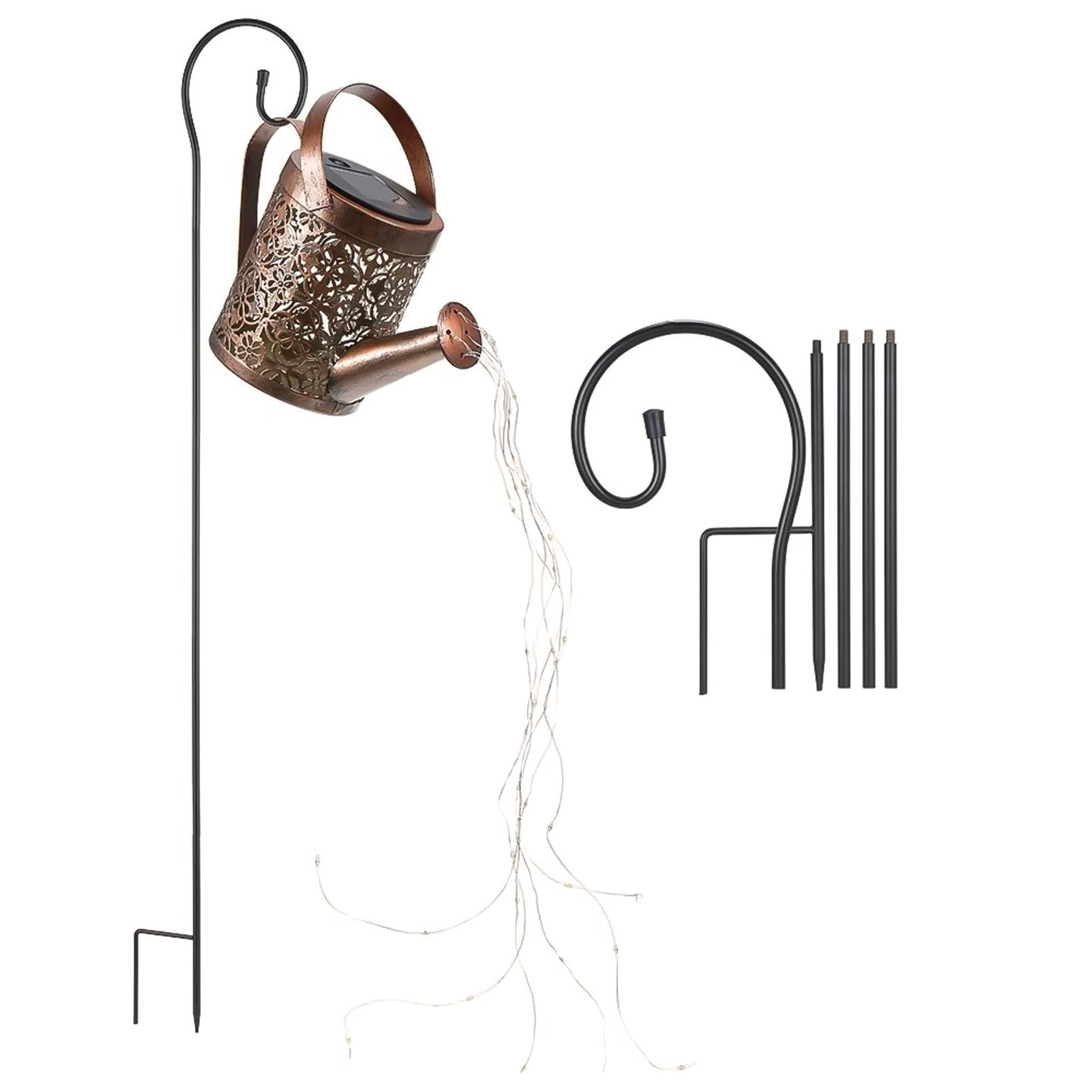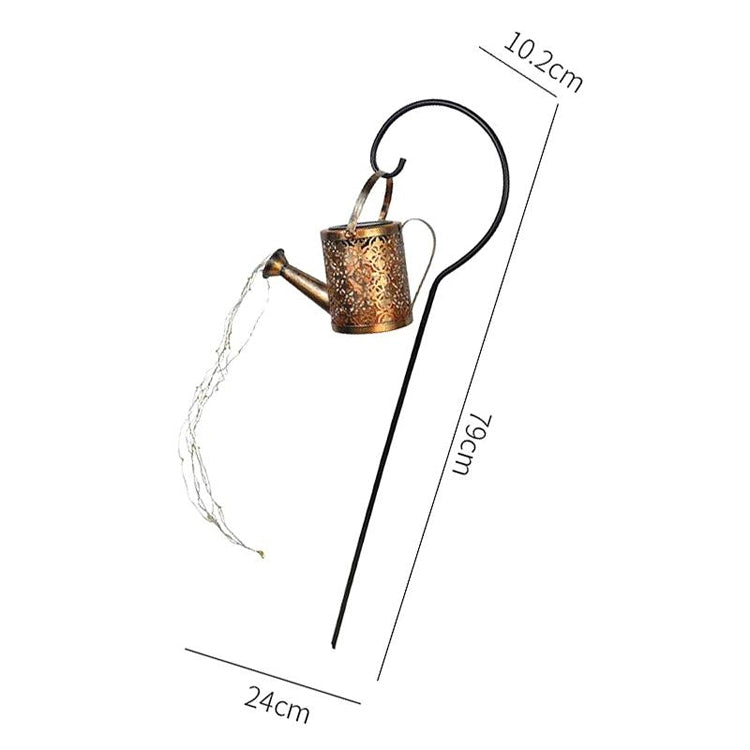 Den här vackra vattenkannan är den perfekta dekorationen för din trädgård eller altan. Med inbyggda LED-lampor som drivs av solceller, skapar den en förtrollande atmosfär varje kväll utan att du behöver oroa dig för batteribyten. Vattenkannan är tillverkad av robust metall och pryds med fina mönster, vilket gör den till ett elegant och iögonfallande inslag i din utomhusmiljö. Enkel att montera och slå på med en knapp, är denna dekoration både praktisk och estetisk.