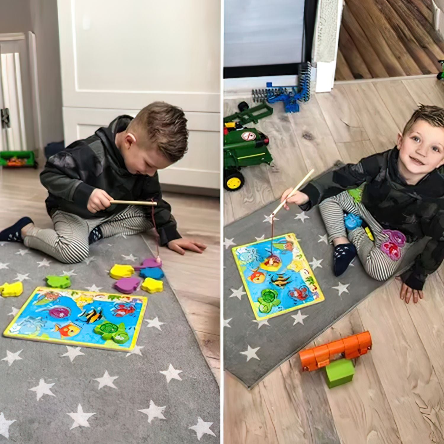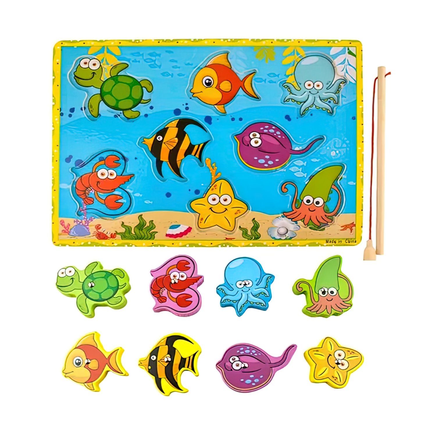 Låt barnen dyka in i en värld av lek och lärande med detta spännande fiskespel. Spelet innehåller en bricka med åtta färgglada marina djur och ett fiskespö utrustat med starka magneter, vilket gör det enkelt och roligt att fiska upp djuren. Samtidigt som spelet underhåller, hjälper det också till att utveckla handmotorik, logiskt tänkande och visuellt minne. Den starka magneten gör det enkelt för även mindre barn att delta och njuta av spelet.