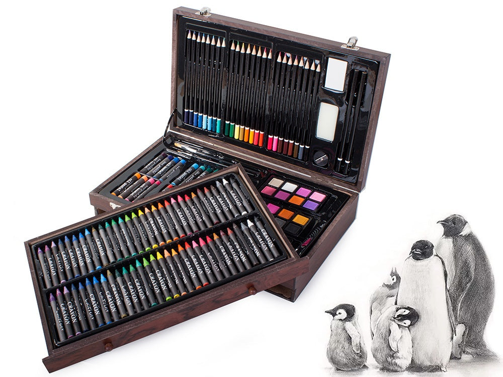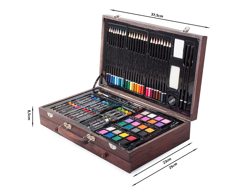 Ge barnen en värld av kreativitet med detta målarset på 143 delar, perfekt för att rita, måla och skapa. Setet innehåller ett brett utbud av tillbehör, inklusive oljepasteller, färgkritor, akvarellfärger, penslar, paletter och mycket mer. Allt är snyggt organiserat i en elegant träväska med handtag, vilket gör det enkelt att transportera och hålla ordning på materialet.