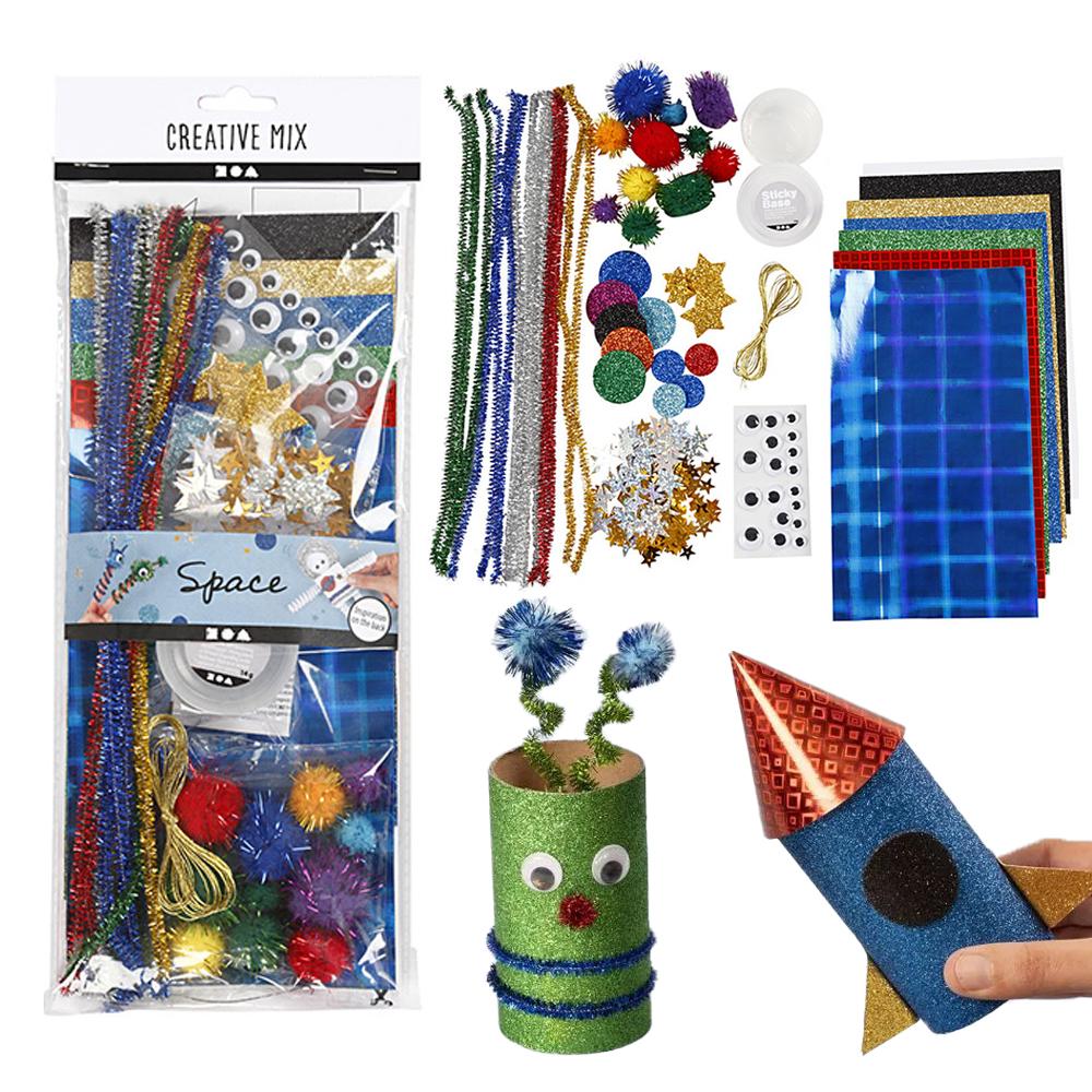 Detta DIY (Do It Yourself) pysselkit är den perfekta uppsättningen för att väcka kreativiteten hos både barn och unga. Med en mix av olika material med rymden som tema, såsom piprensare, stjärnor och glitterpapper, kan du dekorera allt från återbruksmaterial till nya skapelser. Använd setet för fri lek och skapa unika figurer, eller använd de medföljande schablonerna för klipp-och-klistra projekt.