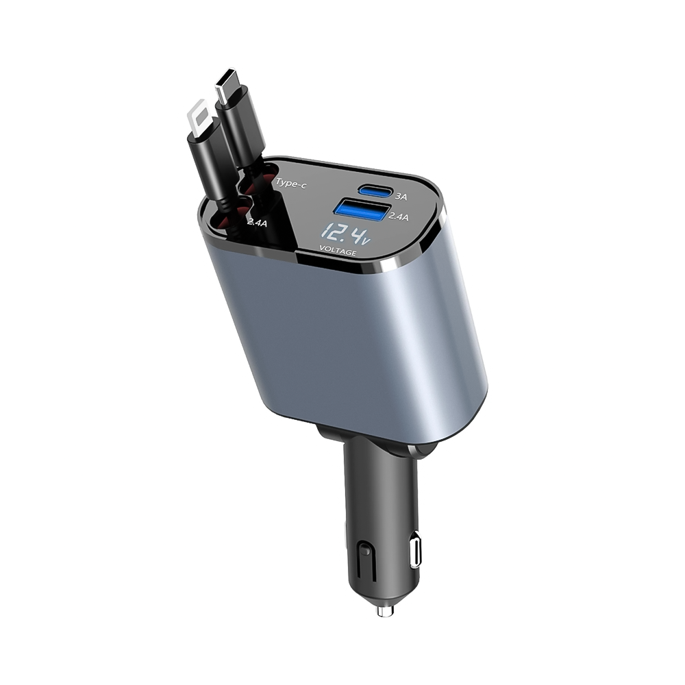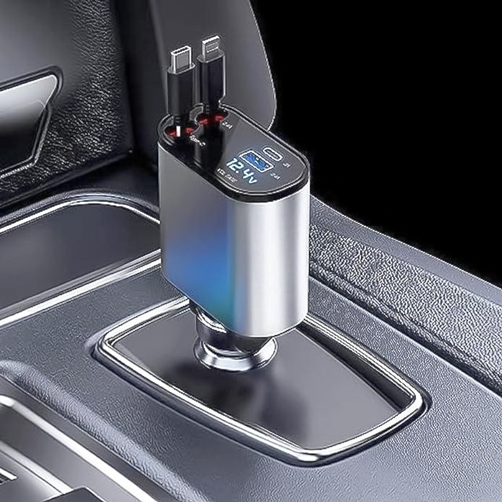 4-i-1 snabb billaddare med utdragbara laddsladdar för iPhone och Samsung med USB-C. Perfekt för alla bilresor!