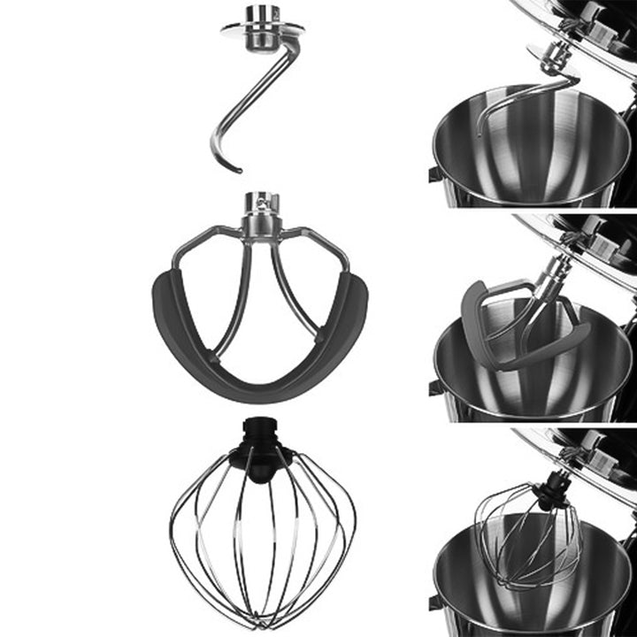 Köksmaskinen stoltserar med en generös 6,2-liters skål i rostfritt stål, komplett med stadigt handtag och stänkskydd, vilket gör hanteringen både enkel och renlig. De medföljande tillbehören inkluderar en visp med silikonribbor för perfekt blandning, en degkrok för tunga degar och en lätt visp idealisk för vispgrädde och äggvitor. Med sex justerbara effektnivåer och en PULS-funktion kan denna köksmaskin hantera allt från lätt vispning till intensiv knådning, vilket gör den till en oumbärlig kompanjon i varje kök.