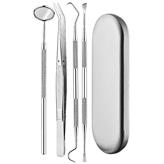 Detta kit med tandläkarverktyg är det perfekta valet för den som vill ta bort plack och tandsten på ett enkelt och ekonomiskt sätt. Med fyra högkvalitativa instrument i rostfritt stål, inklusive två dubbeländiga skrapor, en spegel och en böjd tång, får du allt du behöver för att upprätthålla god munhygien. Ett praktiskt fodral ingår också för säker förvaring, vilket gör det enkelt att ta med verktygen överallt.